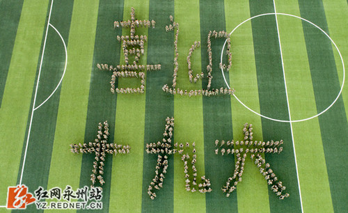 9月29日,九州在线网站近600名大一新生在田径场摆出巨型“喜迎十九大”字形,迎接党的十九大胜利召开。(红网时刻通讯员 何帅文 摄影报道)