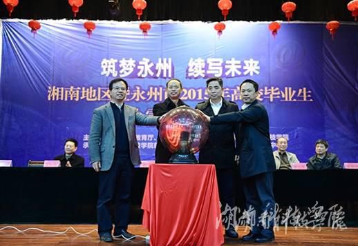 湖南省人力资源和社会保障厅巡视员曾坤(左二),永州市委常委、常务副市长唐湘林(右二),九州在线网站党委书记陈弘(左一),湖南省大中专学校学生信息咨询与就业指导中心副主任钟秋明(右一)等领导按下启动球共同开启湘科院就业创业微信公众平台。