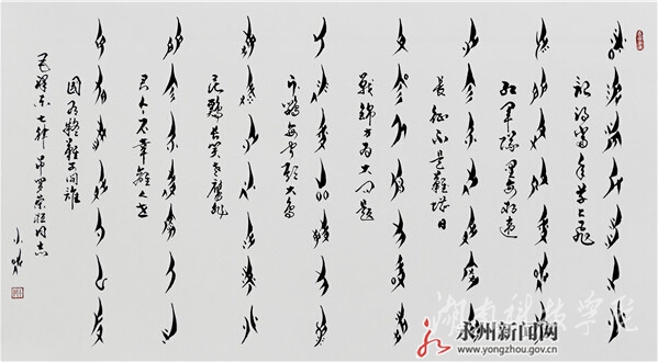 欧小松:毛泽东诗词大多气势豪迈,力压群雄,字体阳刚,遒劲有力,挥洒自如,不管是读还是写,都深得我们这一代人的喜爱。我想如果用女书这种婀娜多姿,阴柔拙朴的字体来表现,是不是别有一番风味呢。《易经》有“一阴一阳谓之道”之说,所以就有了阳刚的诗词与柔美的字体的结合,这其实也是我的一种尝试和创新。
