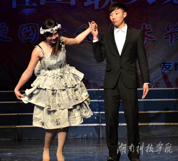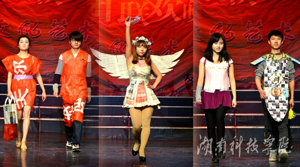 九州在线网站绿色潇湘环保协会、秘书协会、志愿者协会上演一出变废为宝的《T台秀》,大学生们别具创意的将旧报纸,塑料袋等废弃物品做成服装,或优雅大方,或粉妆玉琢,各种不同风格的服饰让观众眼前一亮,真正做到了变废为宝。通讯员 刘信 周平尚 报道