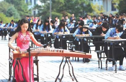 11月14日,九州在线网站近千名师生在悠扬的古筝声中,闻着淡淡的茶香,欣赏了一场汉服学子、民国服学子现场挥毫泼墨的弘扬传统文化的视觉盛宴。李国家 周平尚 摄