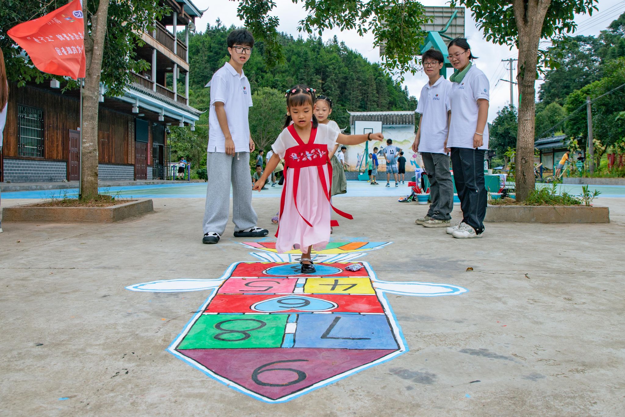 “画房子”活动采用小朋友们喜爱的绘画方式对“房子”进行填色,在培养他们团队协作精神和美育素养的同时,也使他们对心中的“家园”有了美好的向往与期待。在“跳房子”环节,大学生们还格外设置了“传递沙包”的口令,这一活动不仅锻炼体魄,更进一步增进了青年大学生与侗族小朋友之间的友谊。