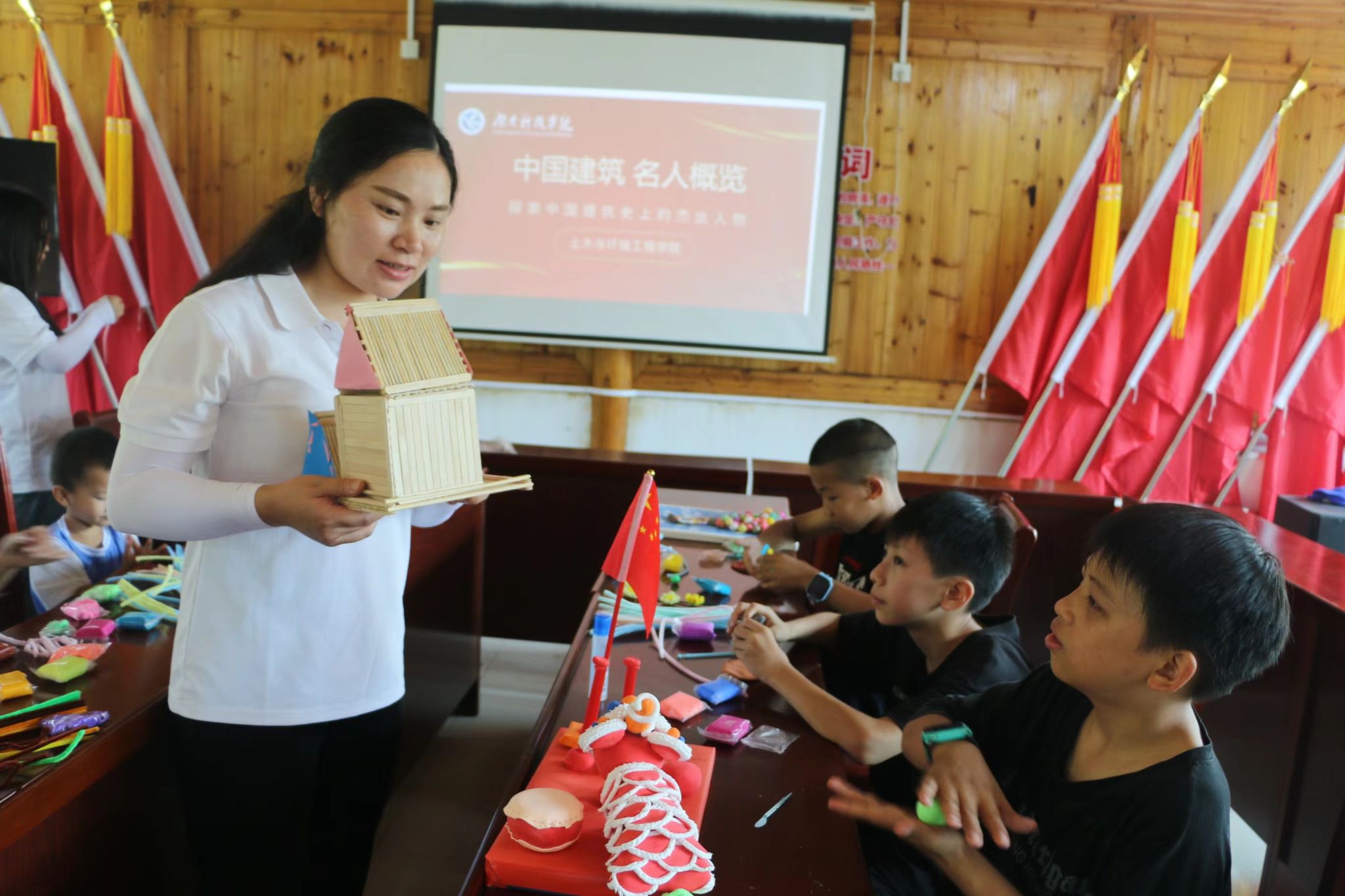 队员们还带着孩子们一起互动合作,利用扭扭棒、黏土、纸盒等材料制作手工艺品,孩子们在制作过程中用心用情,发挥他们的想象力、创造力,与小伙伴们沟通合作,制作了很多有创意的作品,从而体会建筑之美、实践之美。