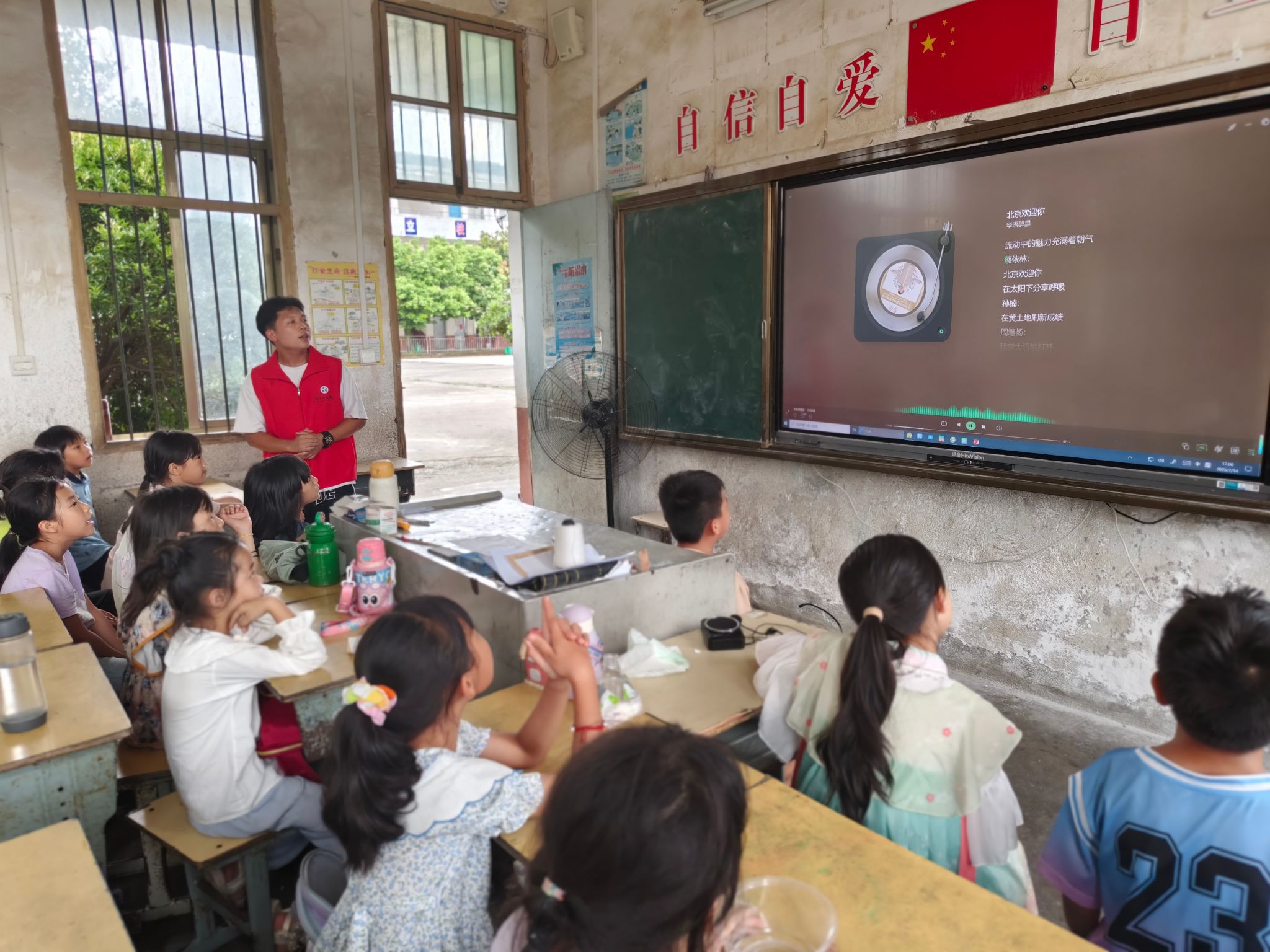 音乐是传递情感的桥梁。当《北京欢迎你》的旋律响起时,孩子们情不自禁地跟着节奏拍起了手。志愿者向鼎文领唱:“我家大门常打开——”,孩子们充满热情的歌声随即充满教室。六岁的张紫涵唱到“开放怀抱等你”时,自然地张开双臂做出拥抱的动作,引得周围的同学和志愿者会心一笑,向鼎文解释道:“爱国也可以像热情欢迎客人来自己家一样,是一件温暖而值得自豪的事情。”
