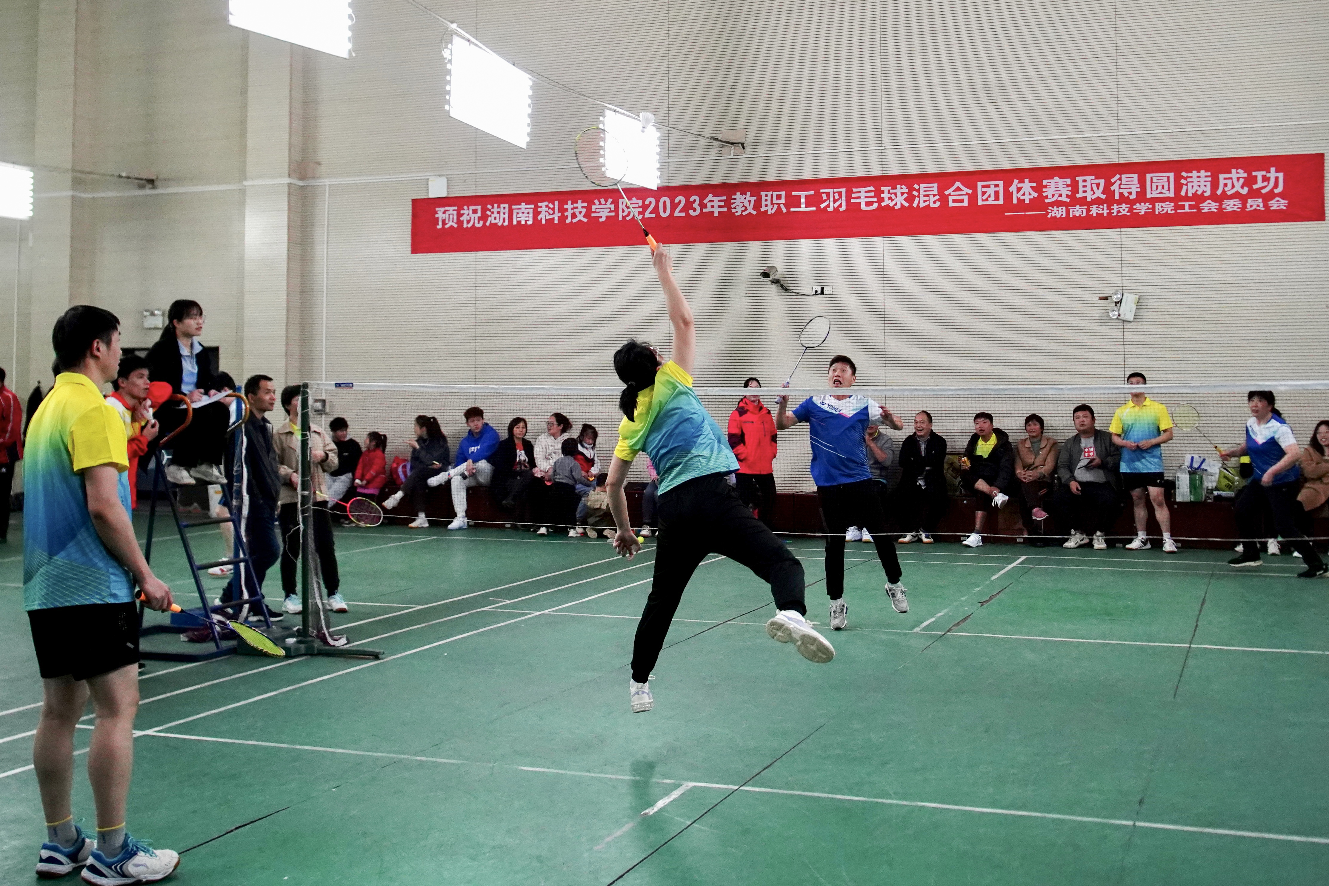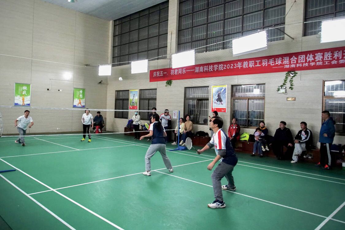 本网讯 4月24日晚,2023年教职工羽毛球混合团体赛在训练馆火热开赛,来自全校各分工会14支代表队的100余名羽毛球运动选手参加了比赛。