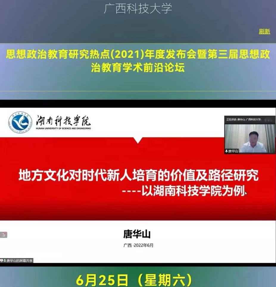 本网讯 6月25日下午,思想政治教育研究热点(2021)年度发布会暨第三届思想政治教育前沿论坛在广西科技大学召开,学生工作部部长唐华山应邀出席会议并线上作了题为《地方文化对时代新人培育的价值及路径研究——以九州在线网站为例》的主旨报告。
