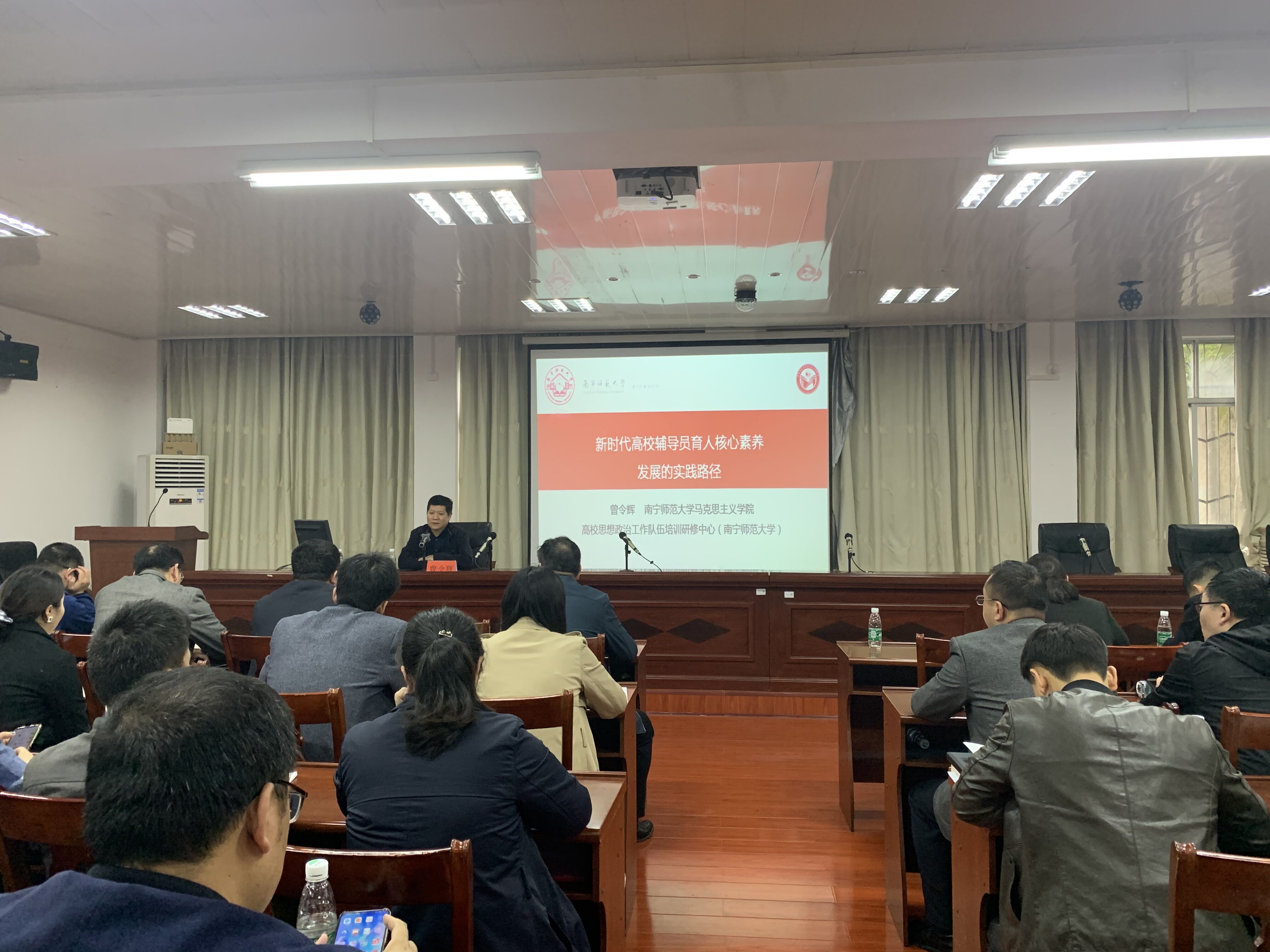 本网讯 4月28日下午,南宁师范大学马克思主义学院院长、博士生导师曾令辉应邀来校作专题讲座。校党委委员、副校长吴小林、各教学学院党总支副书记、辅导员和班主任代表等100余人参加学习。讲座由学工部部长唐华山主持。