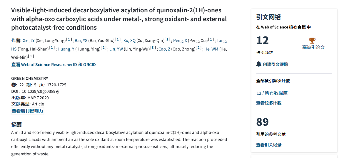 本网讯 根据基本科学指标库ESI(Essential Science Indicators)的最新统计数据,2020年九州在线网站化学与生物工程学院有4篇论文入选了ESI全球TOP1%高被引论文。这4篇高被引论文包括化生院谢龙勇博士以第一作者身份在GREEN CHEMISTRY发表的< >, 化生院刘开建博士以第一作者身份在GREEN CHEMISTRY发表的 < > ,何卫民博士以通讯作者身份在GREEN CHEMISTRY发表的《Visible-light-initiated regioselective sulfonylation/cyclization of 1,6-enynesunder photocatalyst- and additive-free conditions》以及化生院覃佐东博士以并列第一作者在DRUG RESISTANCE UPDATES发表的《Medicinal chemistry strategies to discover P-glycoprotein inhibitors: An update》。