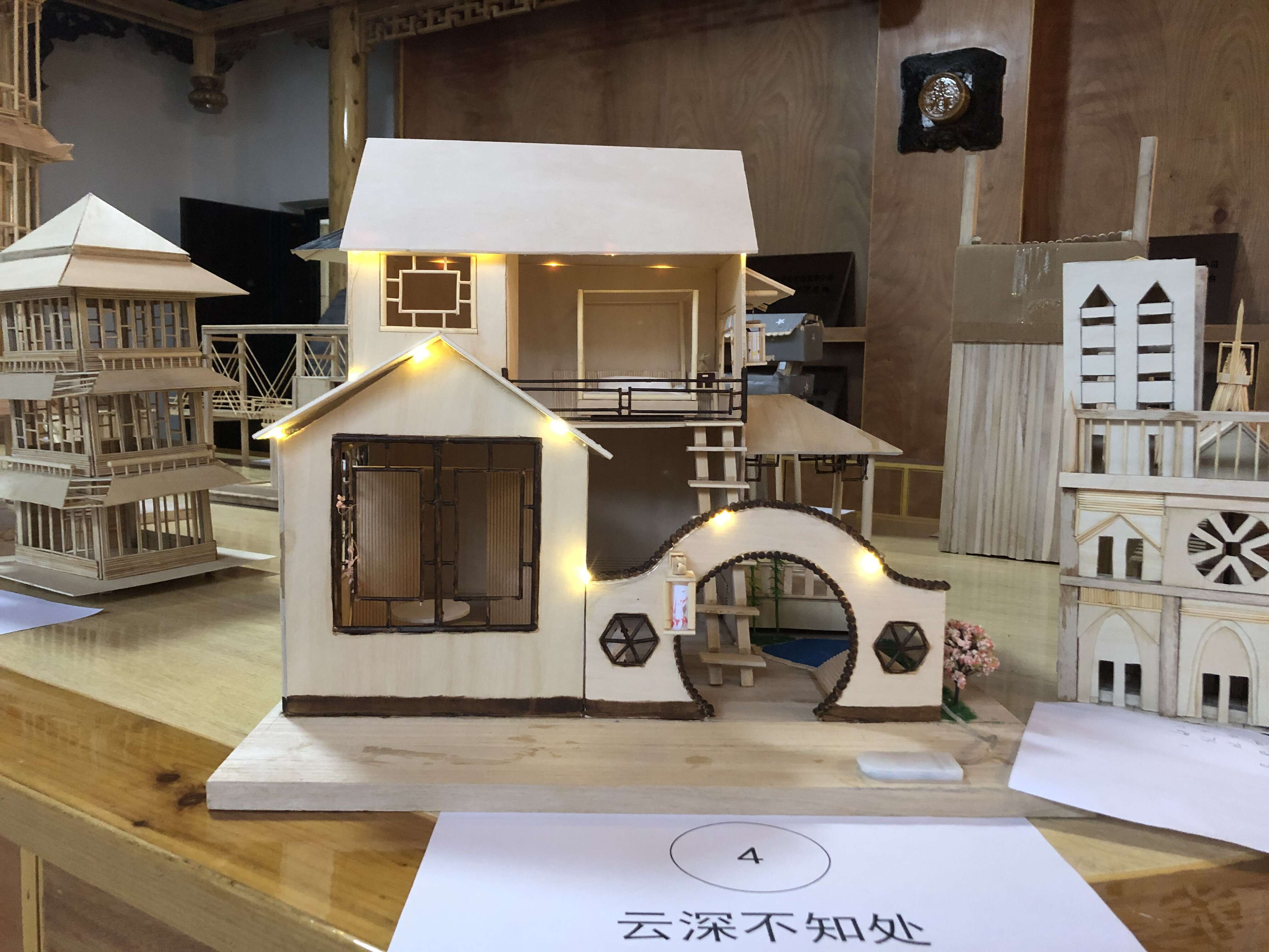 此次比赛共15个小组参赛,共收录15件作品。李鑫小组的《巴黎圣母院》做工精巧,独具匠心,在建筑原有的基础上发挥了他自己独特的理解,最大程度的将巴黎圣母院的特色展现出来。胡小俐小组的《云深不知处》用温馨的小家模式配上昏黄的灯光,让人情不自禁就融入到这座小院之中,正如它的名字,有一股隐世淡泊的情怀。陈子龙小组的《心亭鹊桥》将古代中国人在桥梁设计方面的智慧结晶吸纳融合,展现了古代工匠的智慧。经过评委组评审,李鑫小组创作的《巴黎圣母院》荣获一等奖。