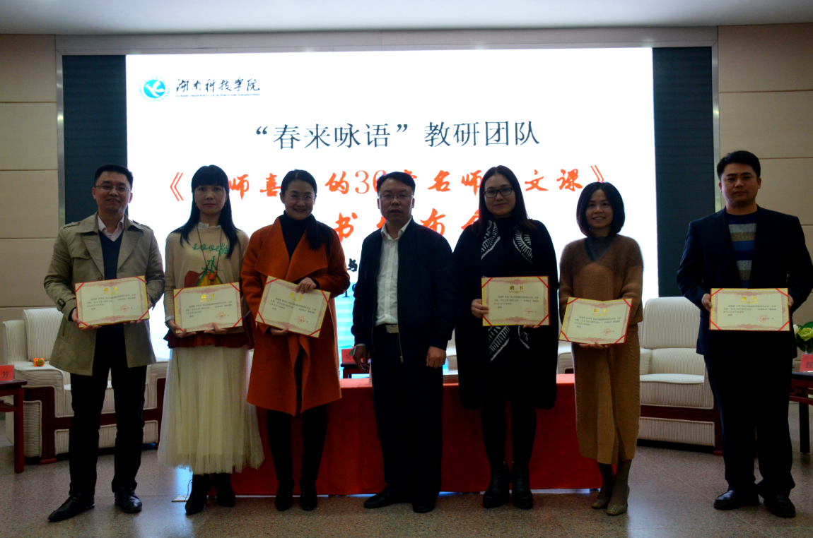 讲座开始前,“春来咏语”教研团队举行了《教师喜爱的36堂名师语文课》新书发布会。谷显明为吴春来、李苏芳、蒋冰芝、唐蓉、桂荣玲、李凯勇、王华、杨琴华老师颁发人文与社会科学学院明德讲坛聘书,聘任他们为明德讲坛讲师。