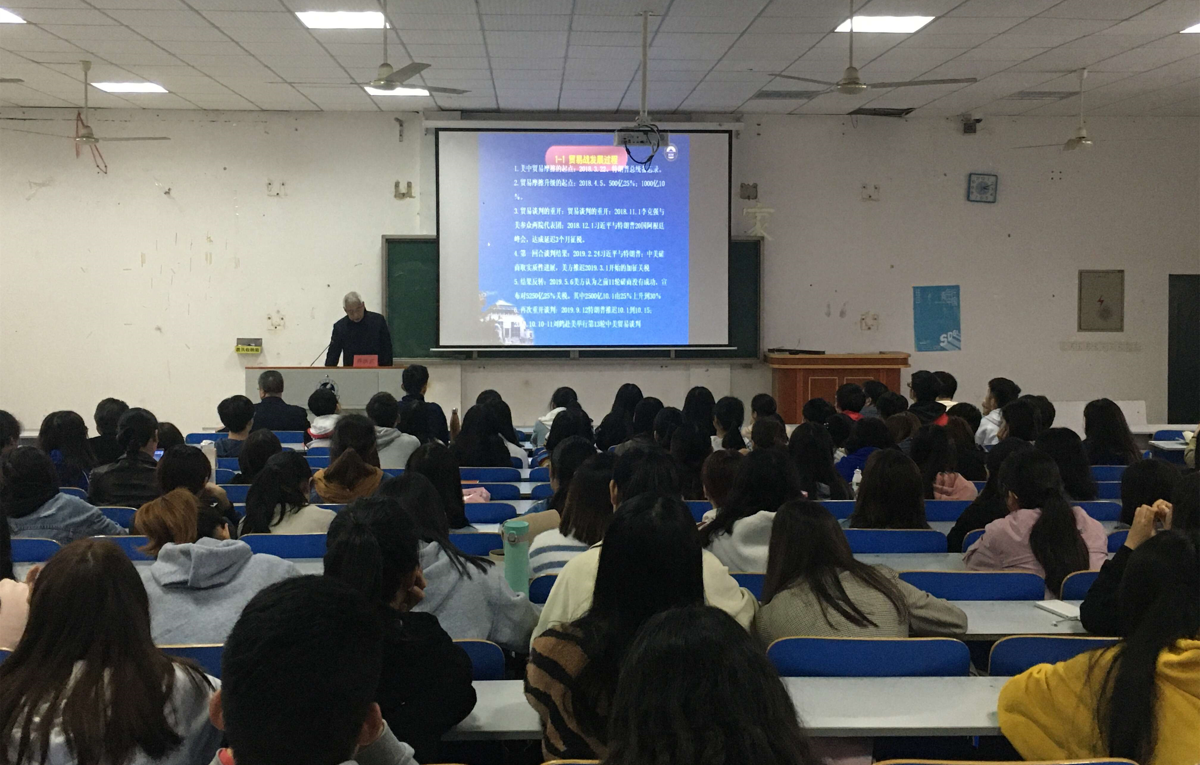 乔洪武为该院师生作了题为《中美贸易战的成因与对策》的讲座。乔洪武讲述了中美贸易战的发展过程,用幽默风趣的语言阐释美对华贸易战的新特点。乔洪武结合具体事件详细的从国内经济、国内政治和国际环境三分方面分析了美国发动贸易战的主要成因。在应对贸易战的对策上,乔洪武从中国政府立场、国家态度展开讲述,他说中国有信心、有决心、有能力应对各种风险挑战,并提出我国应对贸易战应采取的基本措施。