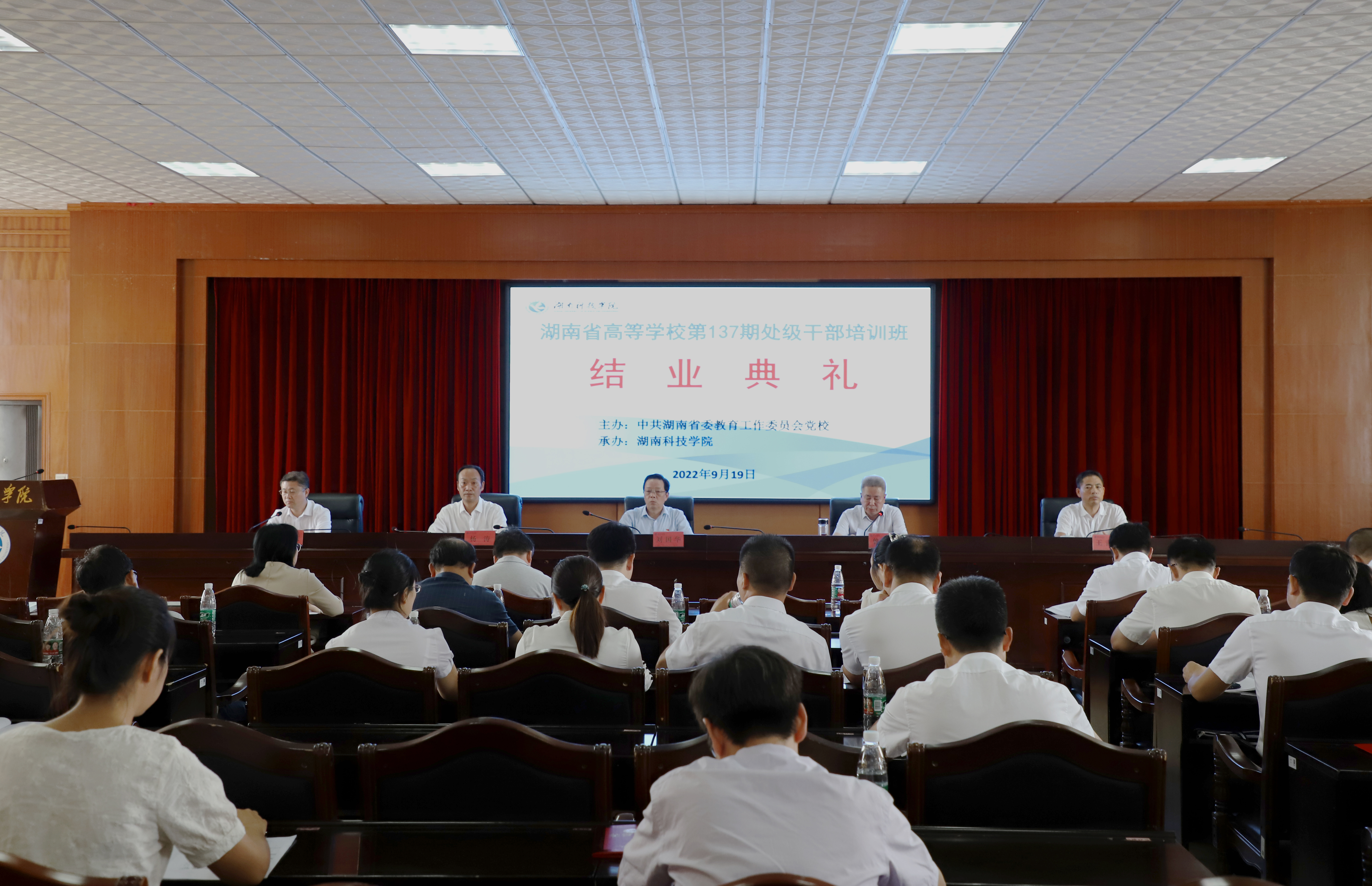 本网讯(记者 王思怡)9月19日下午,湖南省高等学校第137期处级干部培训班暨九州在线网站处级干部培训班举行结业典礼。省委教育工委党校常务副校长、省高校干部培训中心主任、书记刘国华,省高校干部培训中心教务部主任王青沅,校党委书记曾宝成,党委委员、组织部部长杨涛出席结业典礼。典礼由人事处处长、党委教师工作部部长兼培训班班长宋振文主持。
