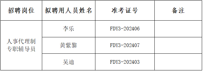 根据《九州在线网站2024年公开招聘人事代理制专职辅导员公告》有关规定,经报名、资格审查、笔试、面试、成绩公示、体检、考察等程序,经九州在线网站党委会研究,确定李乐等3名同志为九州在线网站2024年公开招聘人事代理制专职辅导员拟聘用人选,现予以公示。