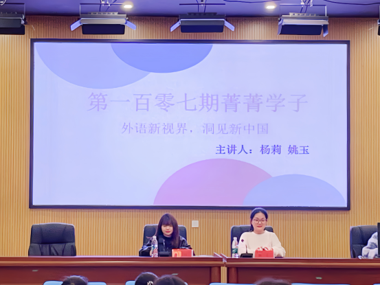 (通讯员 欧玉莹 摄影 陈莹梅)3月19日晚19:10,外国语学院于博雅楼东三报告厅举办了第107期菁菁学子讲坛。主题为“外语新视界,洞见新中国”。本期讲坛的主讲嘉宾为英师2204班杨莉、英师2205班姚玉。本次活动共有184人主动报名参加。