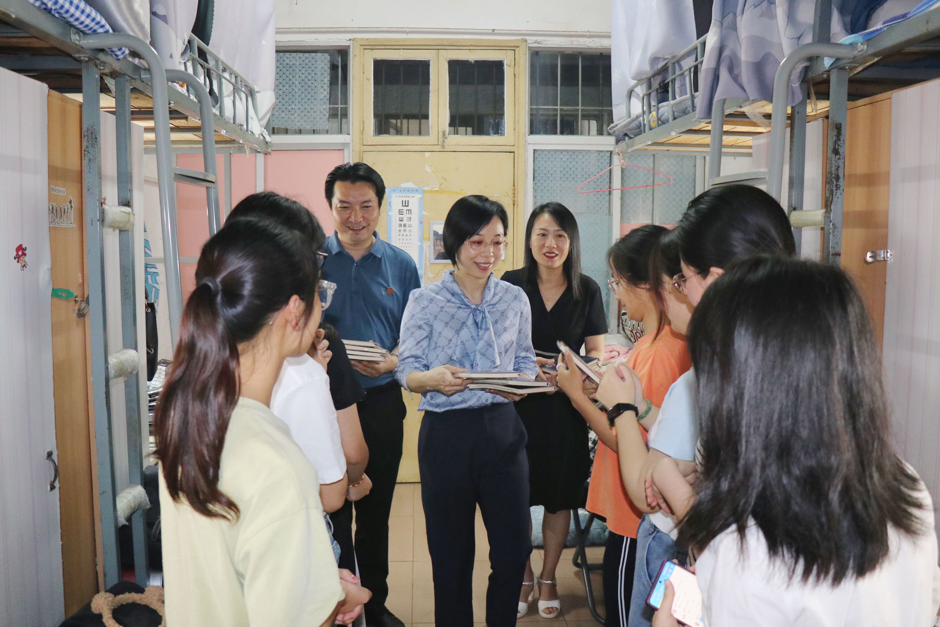 (通讯员 旷湘怡)外国语学院院长何丽萍、党总支书记唐君、党总支副书记罗晶走进学生宿舍为306名毕业生送上了专属定制的毕业礼物——以学院虚拟形象为原型的“毕业系列”钥匙扣和带有院训的限定笔记本。“礼物虽不昂贵,但是却很珍贵。”院长何丽萍说道:“希望各位毕业生能一直记得在外院学习、生活的日子,记住我们在一起的时光,带着学院的期待奔赴各自的未来,走向下一段旅程。”