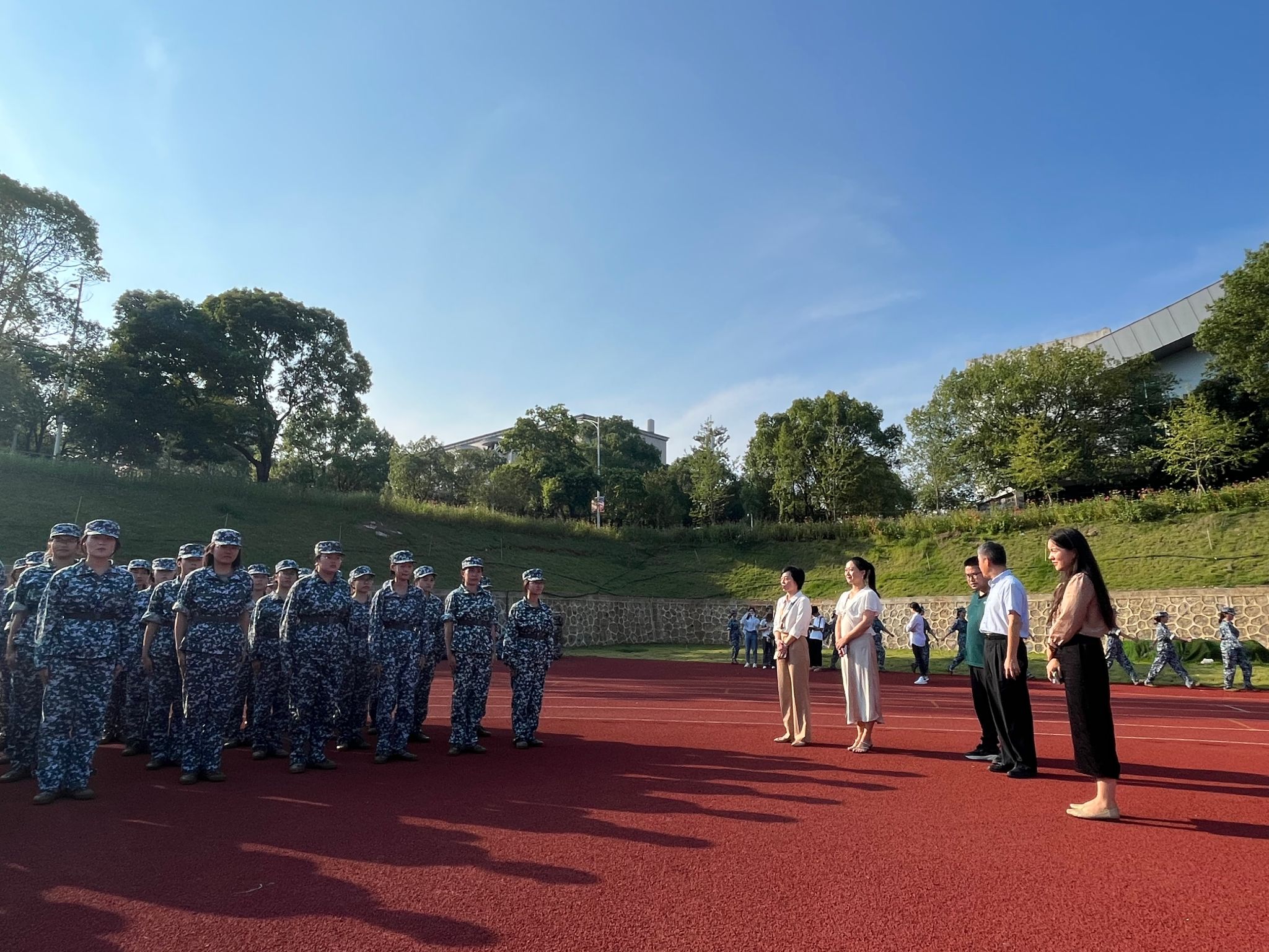 9月26日,学院领导亲临现场视察同学们的军训情况,并为大家加油鼓劲。同学们着装整洁、精神抖擞、步伐铿锵,在教官的严格指导下,一遍又一遍地练习着每一个动作,力求做到最好。尽管汗水浸透了衣背,但没有人轻言放弃,每个人都在努力地超越自己。