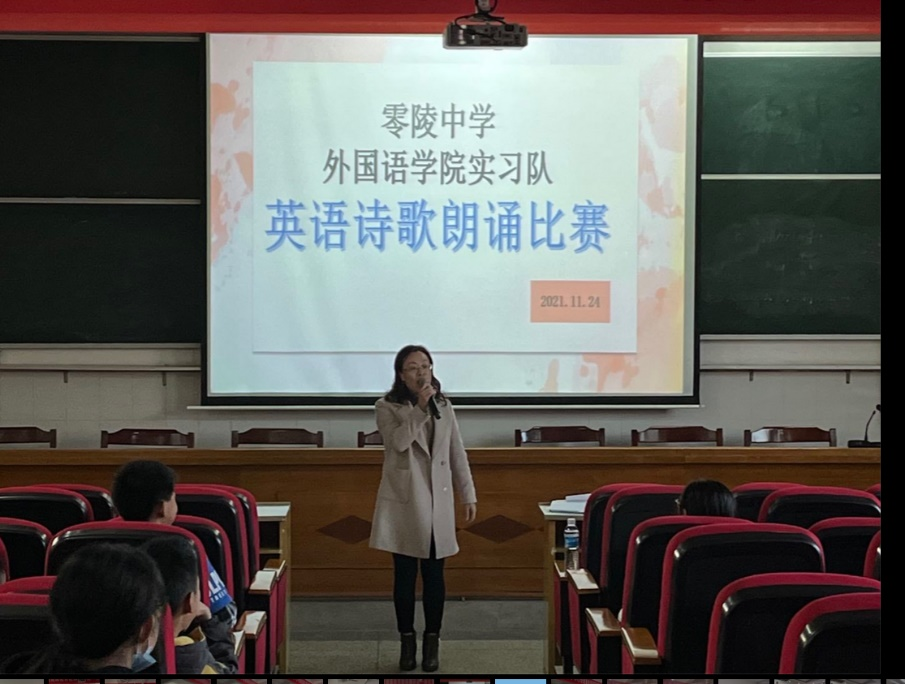 本网讯(通讯员汤凡、李倩)2021年11月24日外国语学院驻零陵中学实习队在科技楼多媒体教室开展“悦读经典,吟诵心声”英语诗歌朗诵比赛,共有来自零陵中学初一年级的12组选手参加。外国语学院副院长、实习带队老师彭宁红,各班英语教师及部分班主任应邀担任评委。本次比赛由2108班实习老师徐雅琪主持。