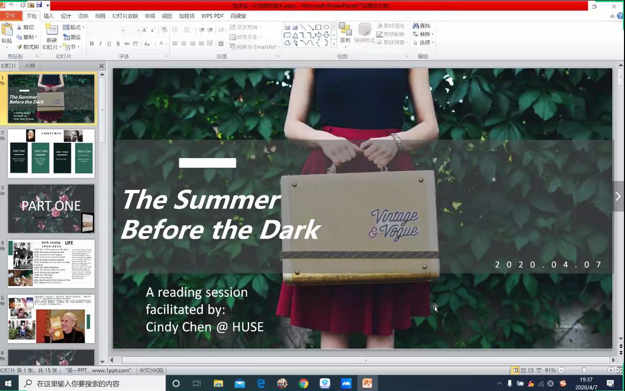 本网讯(通讯员 黄子幸 唐嘉琪)“齐心抗‘疫’,停课不停学”。4月7日晚外国语学院菁菁书院品牌活动“博雅悦读汇” 于线上顺利举行,200多名学生主动报名参加。本次应邀和大家一起悦读的嘉宾是外国语学院专任教师陈碧园副教授,她从教20余年,主讲科目有《英美国家概况》等。此次她分享的书目是多丽丝·莱辛的《The Summer Before the Dark》。