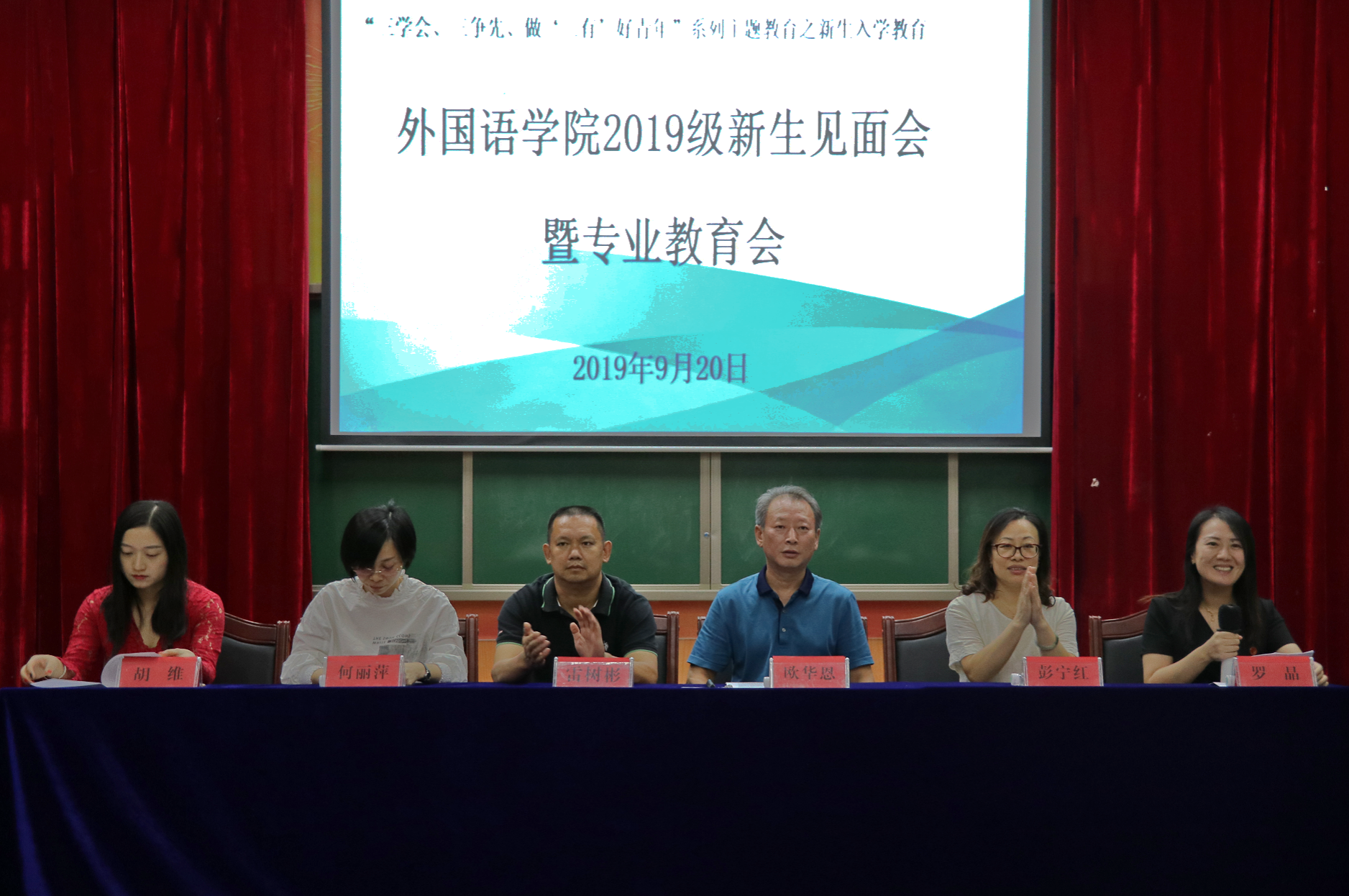 本网讯(通讯员 张露)9月20日,外国语学院2019级新生见面会暨专业教育会在明德楼报告厅举行。本次活动由党总支副书记兼副院长罗晶主持。院长欧华恩教授、党总支书记高级政工师雷树彬、副院长彭宁红、副院长何丽萍、副院长胡维、全体辅导员以及全体19级班主任和新生出席活动。