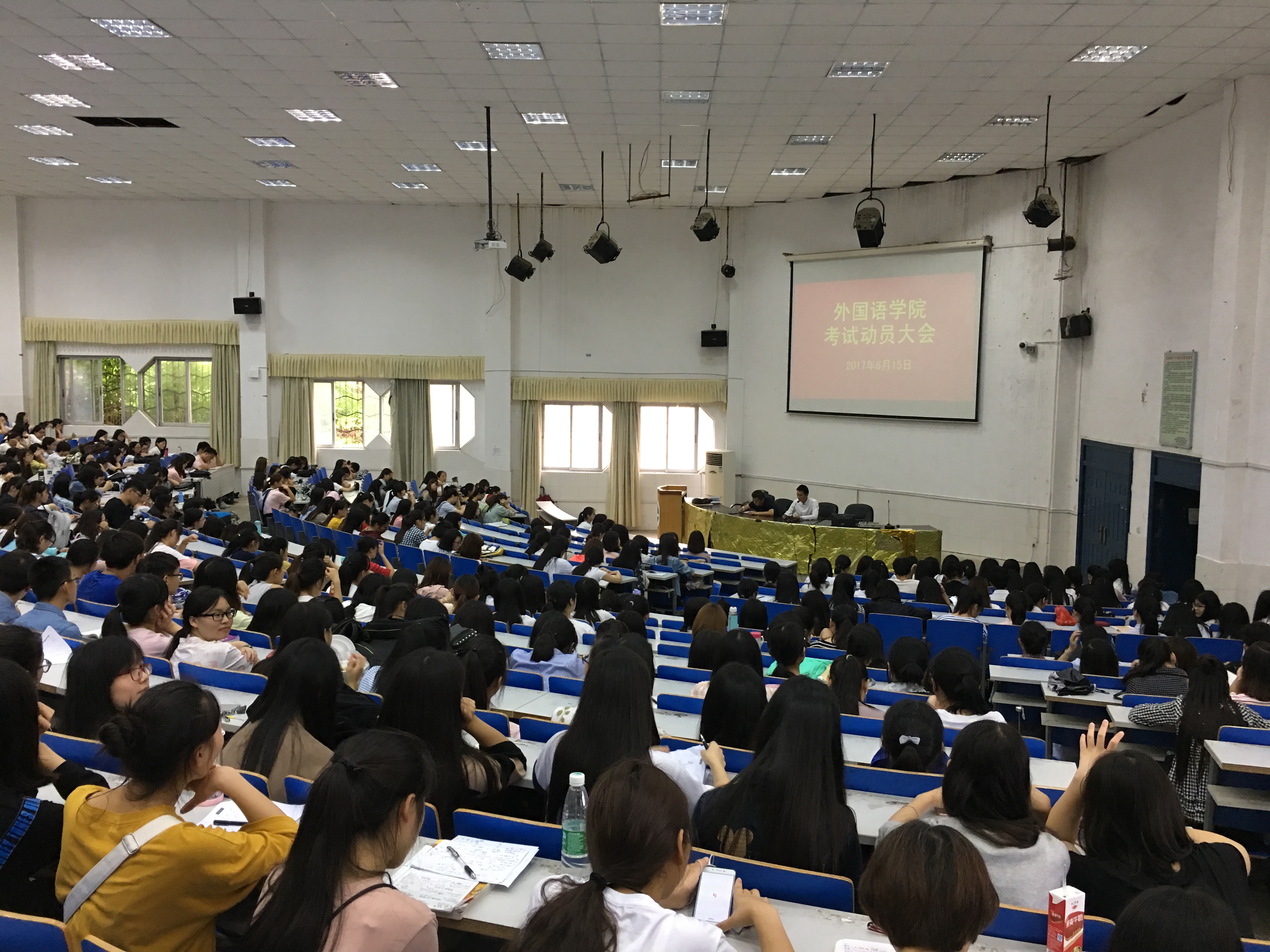 本网讯(通讯员 陈金萍 涂明珠)临近期末考试,为进一步严肃考风考纪,创建良好的考试环境,营造良好的学习氛围,6月15日中午,外国语学院在日新楼212举行考试动员大会。出席本次会议的有外国语学院党总支副书记王瑛、学工办主任胡赟、各年级辅导员以及学院全体学生。会议由胡赟主持。