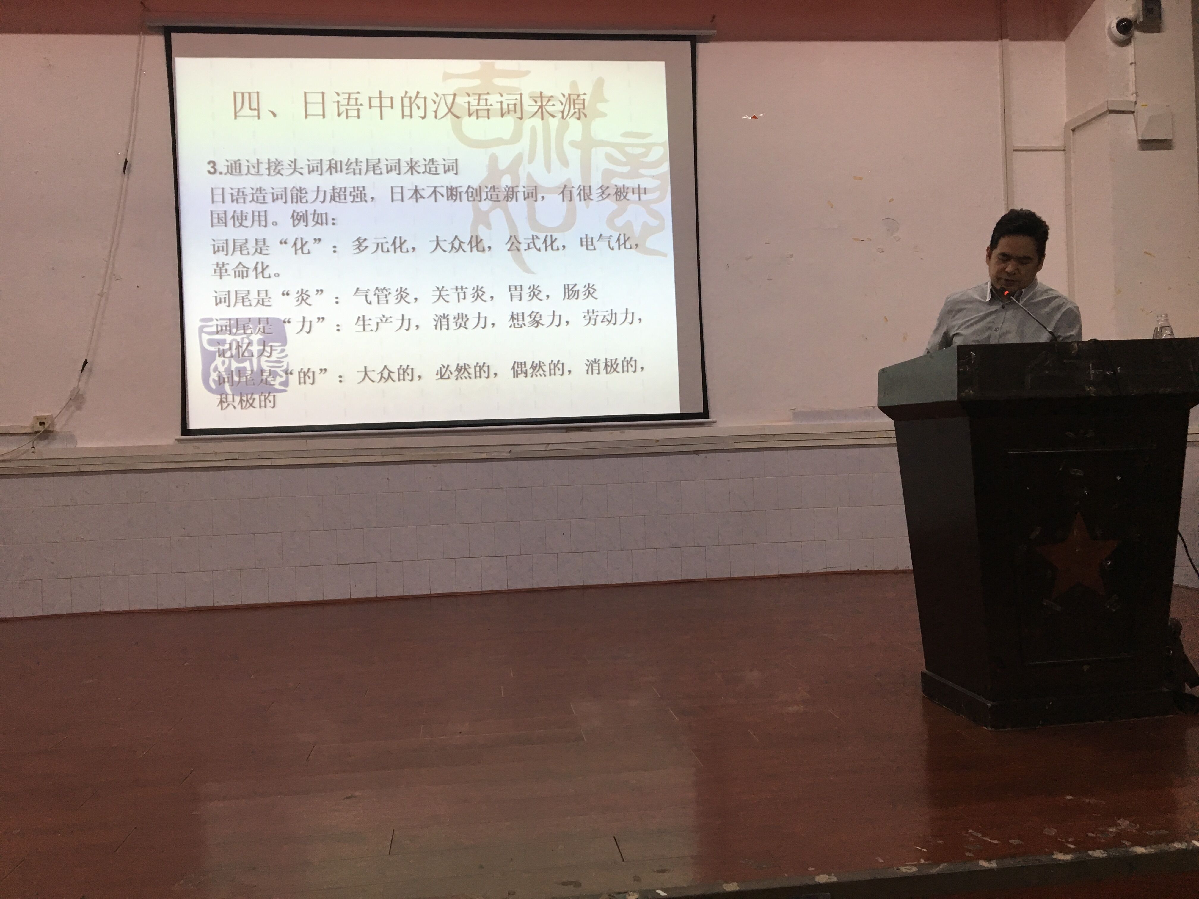 (通讯员 王珊珊)5月19日晚,解放军外国语学院李先瑞教授应邀莅临我校,在外国语学院东三报告厅开展了以《日语词汇漫谈》为主题的学术讲座。外国语学院副院长张剑副教授主持讲座,日语系全体师生参加了本次讲座。