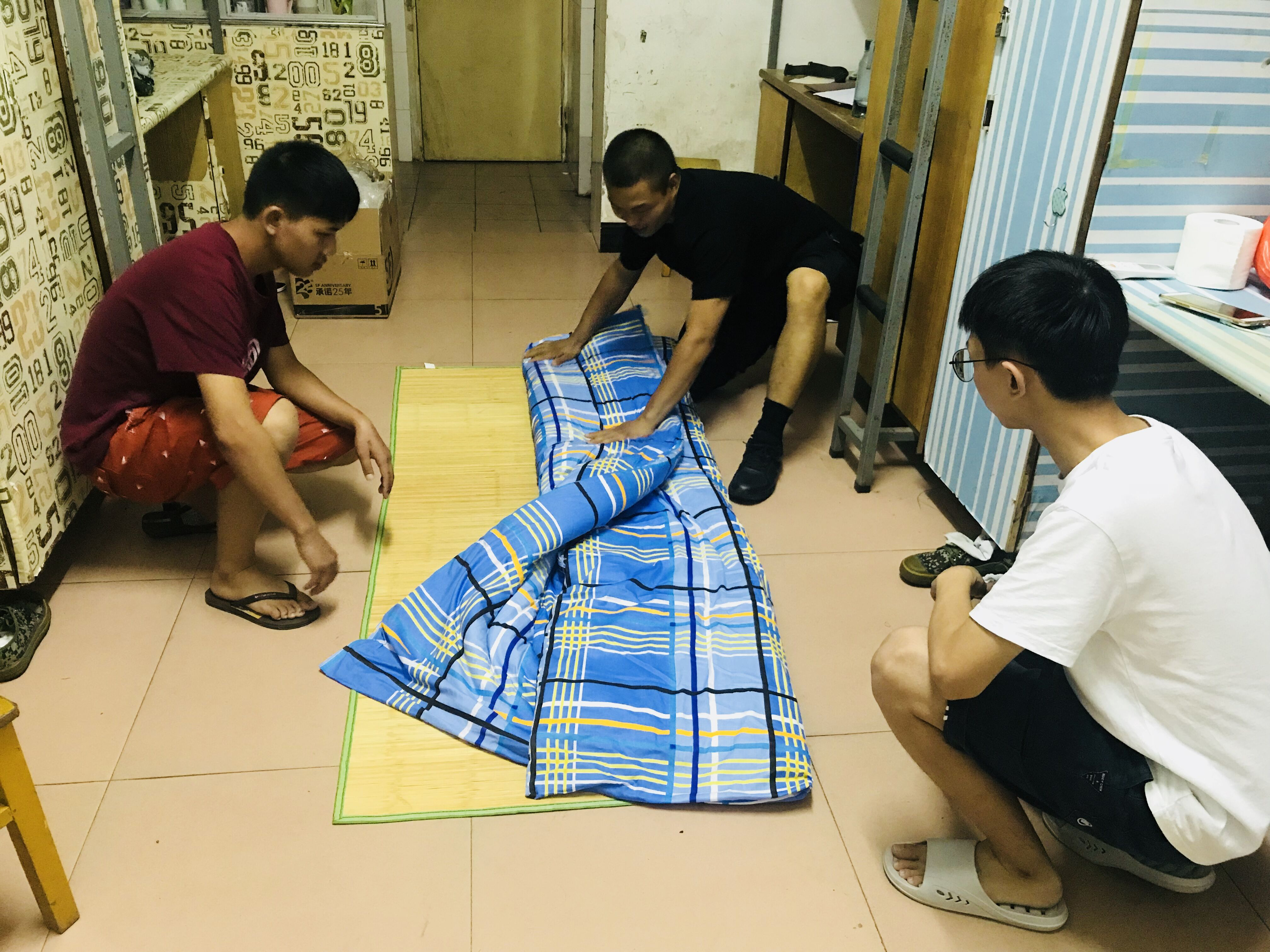 晚上,2015级退伍学长李向阳来到新生宿舍,手把手详细地教导2018级新生如何叠出整齐的军被。学长一遍又一遍地讲解和示范,新生们也在周围认真地学习。学长为同学们演示了叠好军被的几个步骤并进行了详细的分步讲解,经过虚部掏平、压平、两次对折等步骤,一个标准的“豆腐块”便完美呈现在同学们面前。而后,同学们谨记叠军被要领,严格按照步骤,经过几次练习,一个个豆腐块出现在学生面前,同学们都露出欣喜之色。