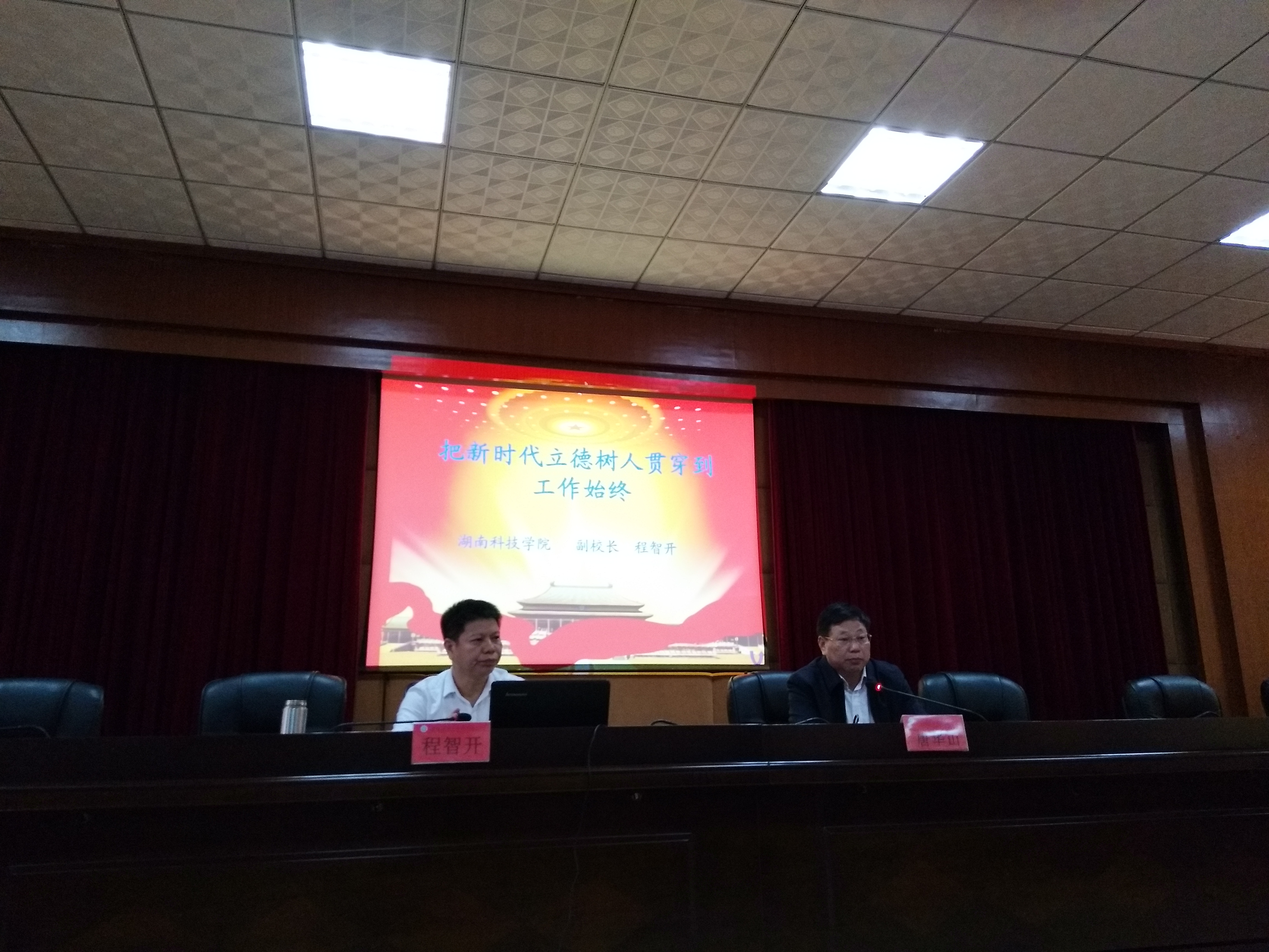 程智开在讲课中强调要深入学习和领会全国教育大会的精神实质,把“立德树人”根本任务贯穿到教育教学全过程,牢牢把握思想政治工作的“生命线”,努力培养德智体美劳全面发展的新时代大学生。在做好学生工作的过程中,主要从以下几个方面“下功夫”:一是打牢自身基础,在政治素质、思想意识、品德行为、专业本领上发力;二是掌握管理技巧,培养好骨干力量;三是做好“严、紧、引、服”文章,对待学生要严格管理、加强引导、贴心服务;四是保持开拓进取精神,充分利用网络平台,创新开展思想政治教育活动。
