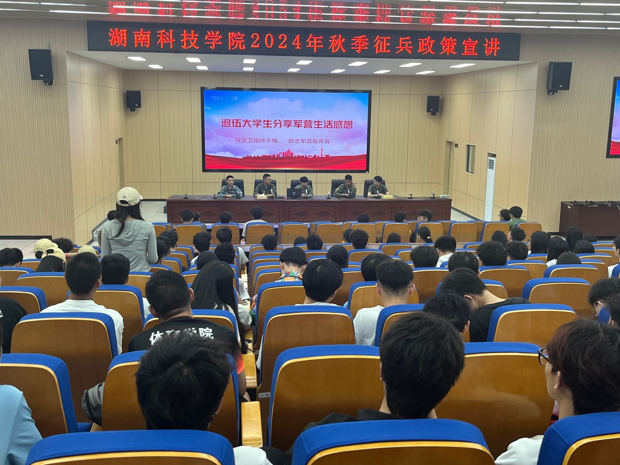 本网讯(学工部)5月27日,参军报国当少年,岁月无悔正青春。为贯彻落实习近平强军思想的重要举措,积极响应国家征兵政策,做好2024年秋季征兵工作,激发我校青年学子参军报国热情,充分发挥高校征兵主阵地作用,学校在明德楼100报告厅开展“‘携笔从戎,明日英雄’2024年秋季征兵政策宣讲”活动,活动吸引了近300人参加。