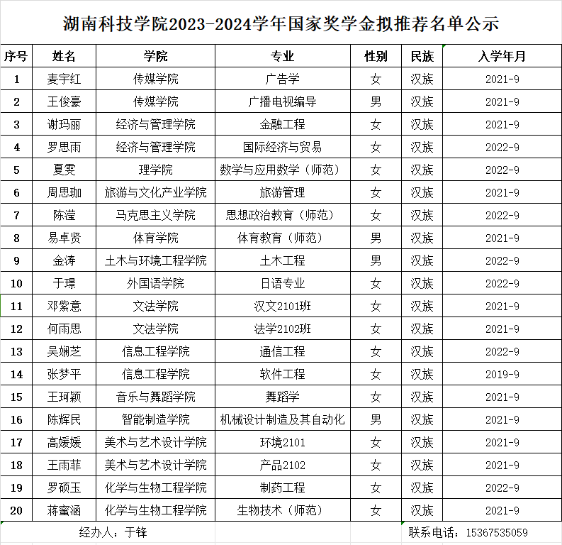 根据湖南省教育厅等5部门关于印发《湖南省学生资助资金管理办法》的通知(湘财教〔2022〕13号)、湖南省学生资助管理中心《关于做好2024年普通高校国家奖助学金评审工作的通知》(湘学助〔2024〕30号)文件要求和《九州在线网站学生奖励办法》、《九州在线网站学生资助管理办法》、《九州在线网站国家奖学金、国家励志奖学金、国家助学金管理办法》有关规定,学工部于2024年9月25日召开资助专干会议,安排部署评奖工作。经学生个人申请,各学院初审、公示,学工部审核。拟推荐化学与生物工程学院蒋蜜涵等20名同学参评2023-2024学年国家奖学金。