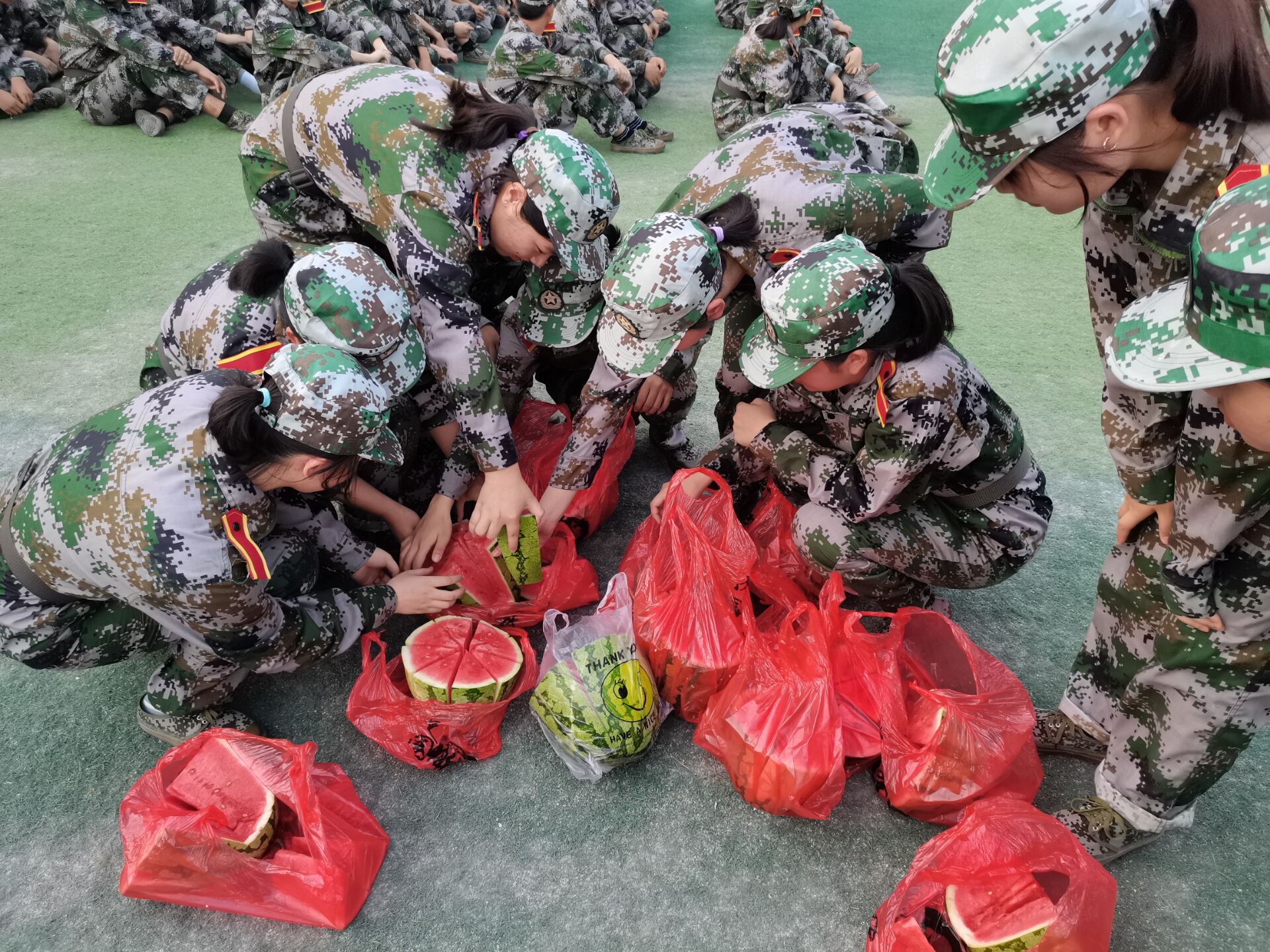 “军训这么热的天还能吃到西瓜,太爽了”“那么多个大西瓜排排站,学院真是太给力了,大爱信工院”同学们拿着又红又大的西瓜喜不自胜,脸上洋溢着快乐和满足。