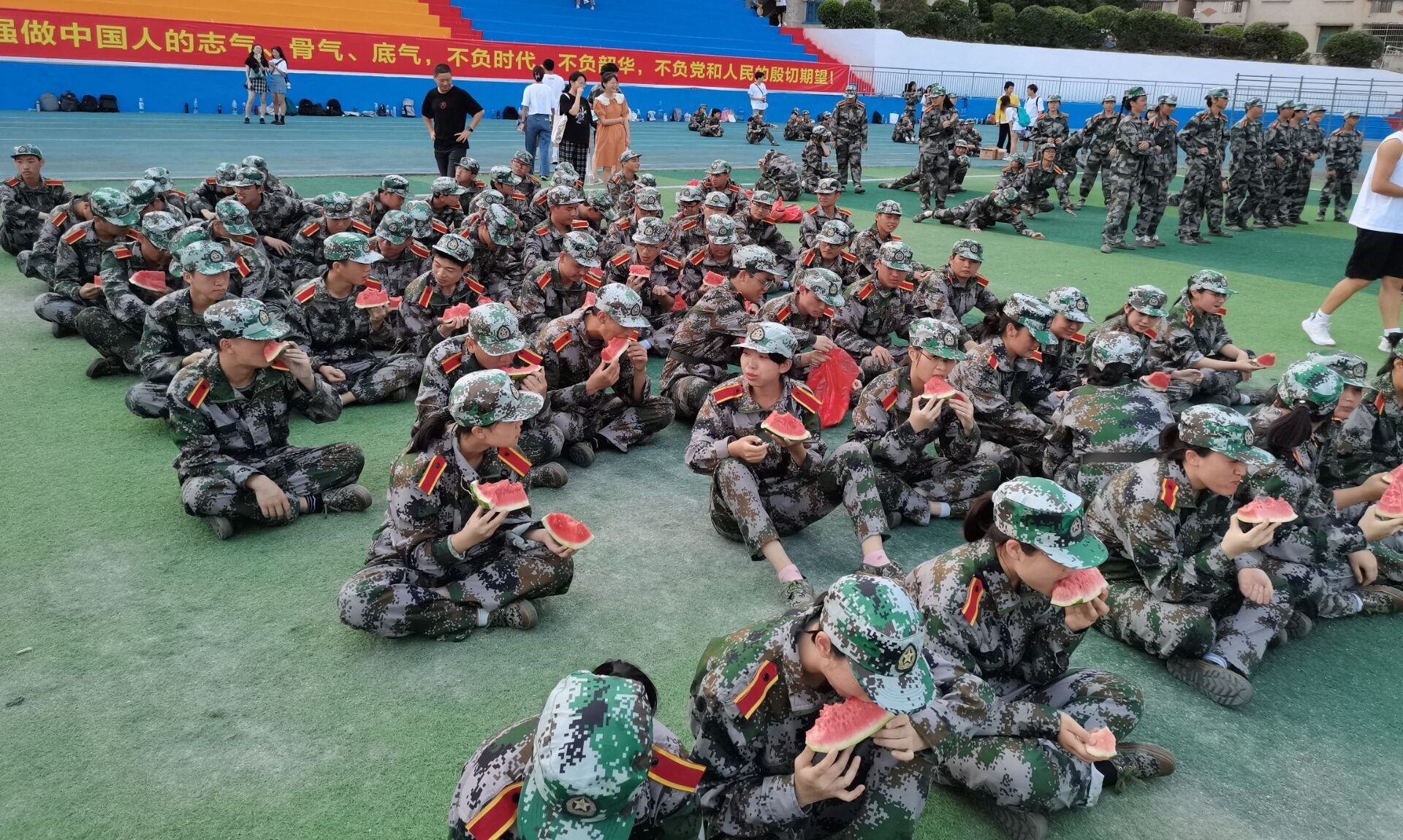 本网讯(通讯员 颜叶娟 陈紫萱)骄阳似火锻坚韧,挥汗如雨淬脊梁。在田径场上,我院2021级新生军训正在紧张有序地进行。9月16日下午,学院新生辅导员、班主任和副班们带着近500斤西瓜“犒劳”正在训练的新生和教官,送去学院的慰问和关心,给大家消暑降温,加油鼓劲。