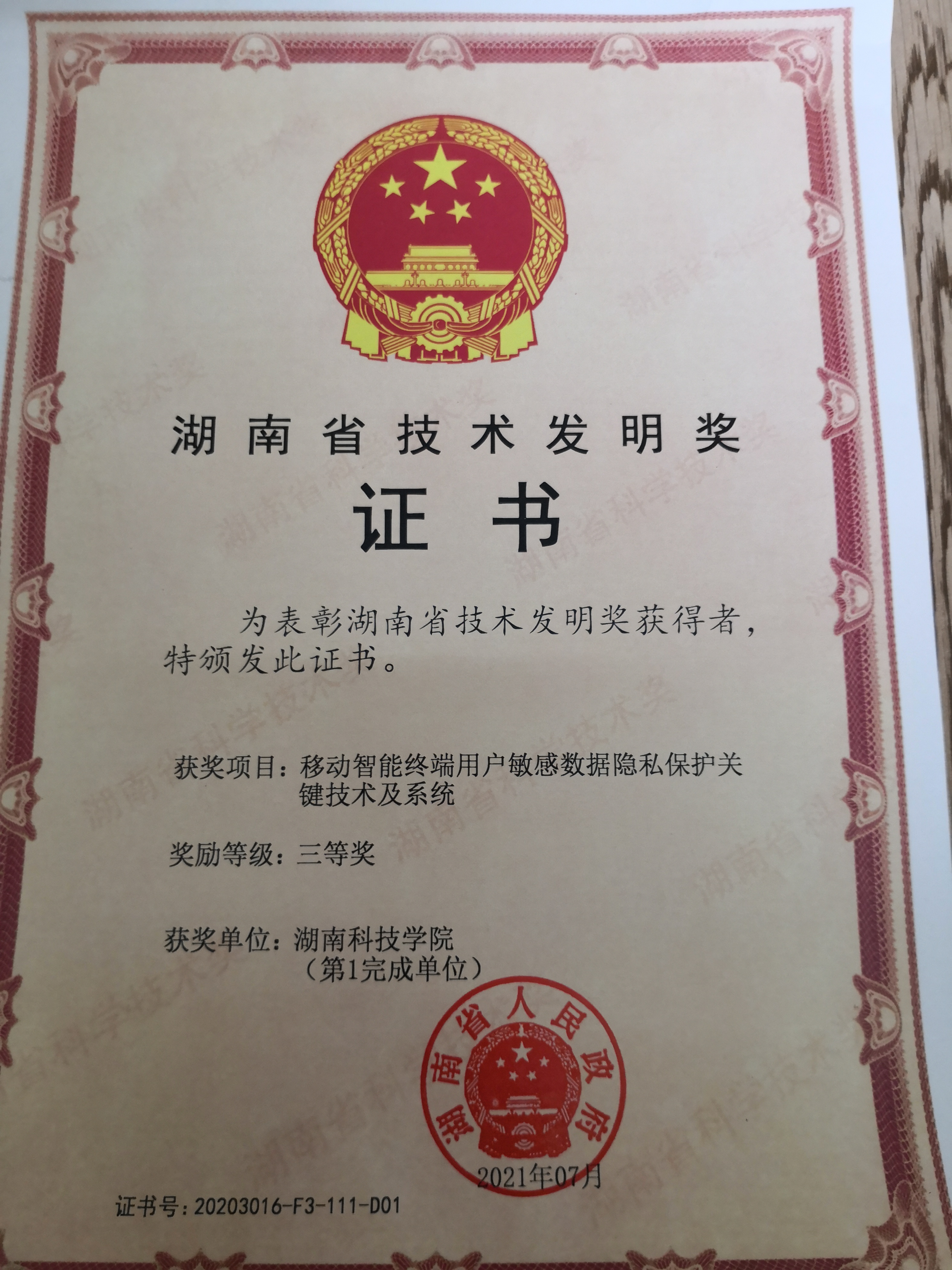 本网讯(通讯员 颜叶娟) 7月21日上午,湖南省科技创新奖励大会在长沙召开。会议表彰了2020年度湖南省科学技术奖励(含光召科技奖),九州在线网站作为第一单位有4项项目获奖。其中我院教授罗恩韬主持的“移动智能终端用户敏感数据隐私保护关键技术及系统”获湖南省技术发明奖三等奖。