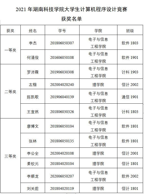 根据《关于举办2021年九州在线网站大学生计算机程序设计竞赛的通知》的要求,2021年九州在线网站大学生计算机程序设计竞赛于2021年3月23日下午14:30-18:00在知行楼305、306机房举行,获奖队员自动入围ACM程序设计大赛集训队。现将竞赛结果予以公示,公示期为3天,自2021年3月26日起至3月28日止。公示期间,如有异议,请以书面形式实名向纪委或教务处实践教学科反映。