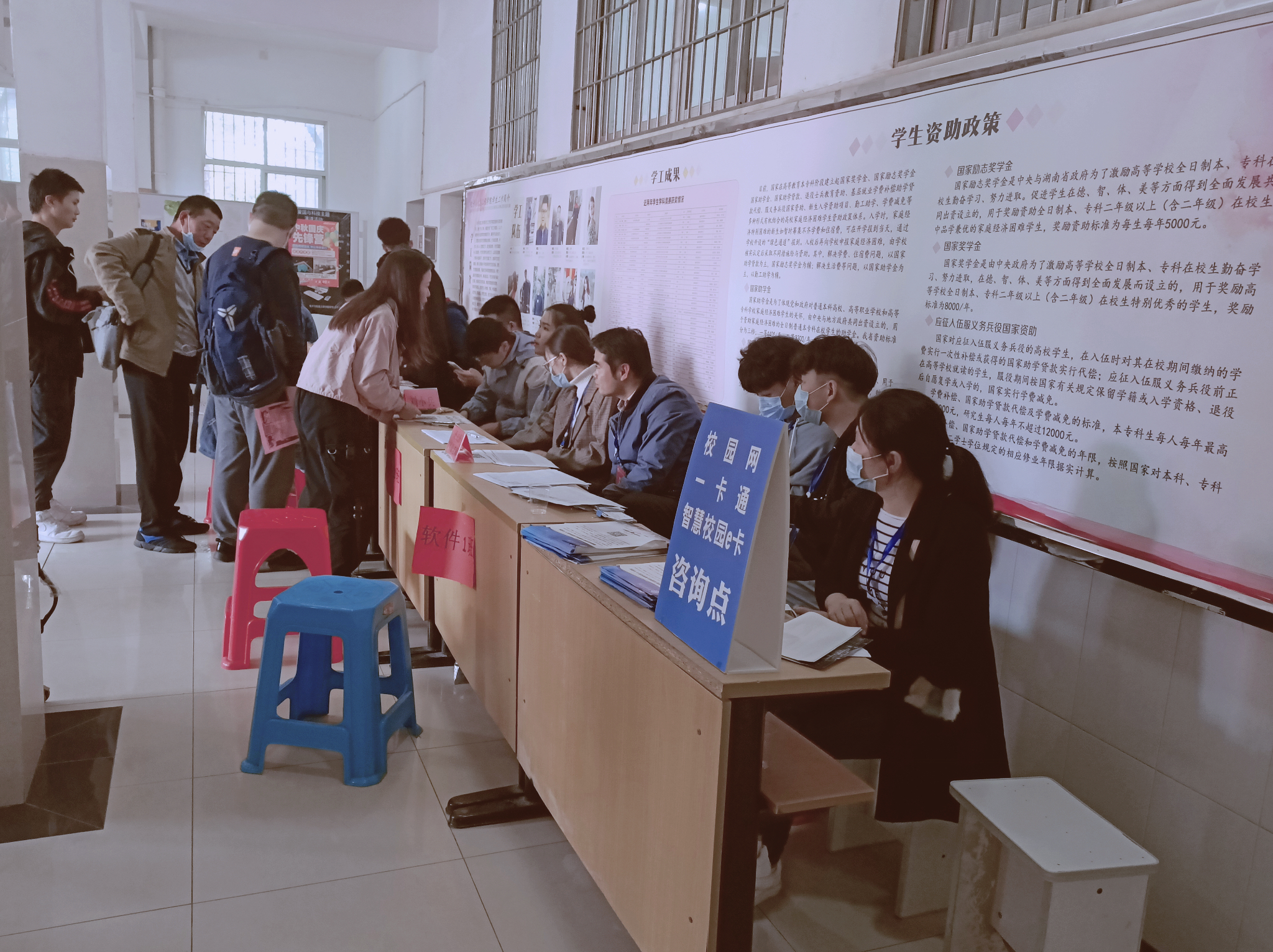 在火车站设立的接待点,带队老师和迎新志愿者们早早地就在火车站等候着。当每趟车的新生和家长一下车,他们便马上微笑着迎上去问候,并帮着分担新生和家长手中沉重的行李。